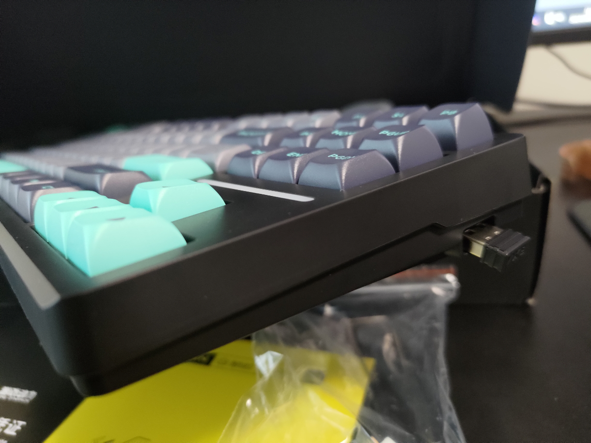 側面にワイヤレス接続用のレシーバーが差し込まれていますので、ワイヤレス接続する場合はこちらを差し込み
